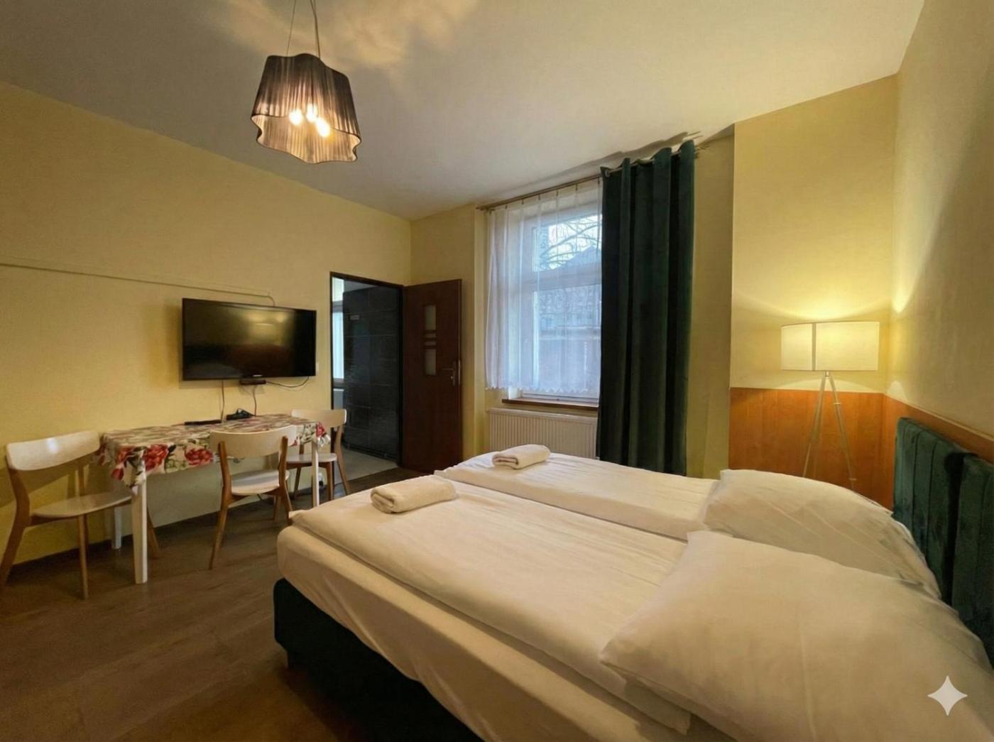 Pokój rodzinny z łazienką. The family room features a tea and coffee maker, a dining area, as well as a private bathroom boasting a shower and a hairdryer. The family room provides a wardrobe, parquet floors, heating, a flat-screen TV, as well as city views. The unit has 5 beds. Rodzinny - 5 osobowy. Powierzchnia pokoju ok.: 35 mkw. ;